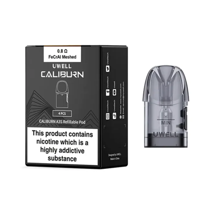 Uwell Caliburn A3S Replacement Pods, offering a 2mL refillable capacity, integrated 0.8ohm/1.0ohm coils, and comeās in a pack of four.